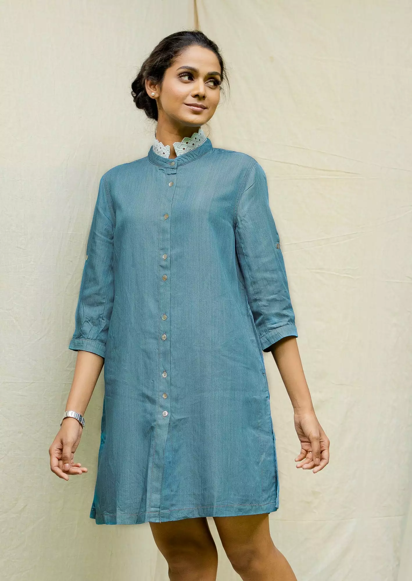 Blue Cotton Shirt Dress with Waist Tie Belt